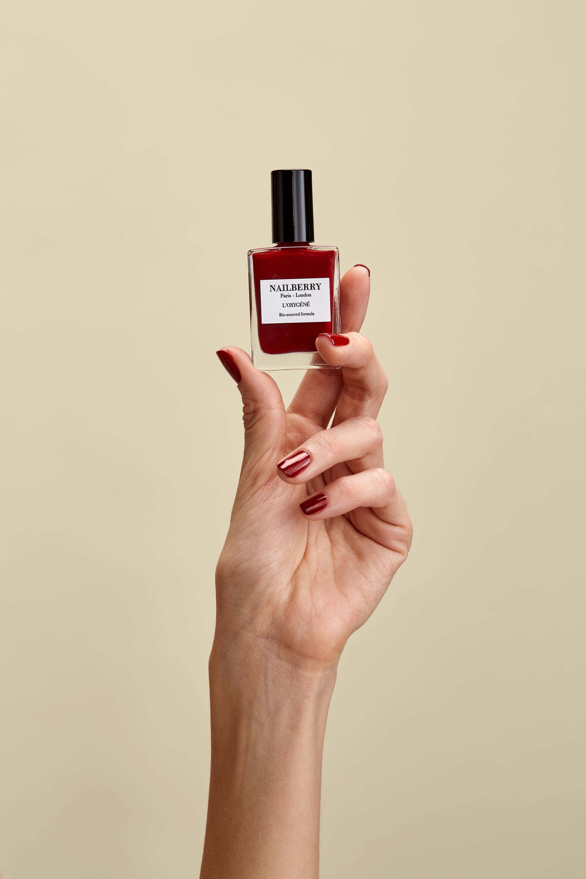 Dip brush into chosen L’Oxygéné Colour, remove excess from brush, then apply one thin layer to each nail. Allow 2-3 minutes to dry, then apply a second thin layer to each nail and allow to dry.